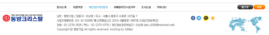 즐겨찾기 회사소개 이용약관 개인정보처리방침 이메일무단수집거부 오시는길 커뮤니티 홈으로 위로 동방크리스탈 이메일 사업자정보확인 홈페이지제작 즐겨찾기